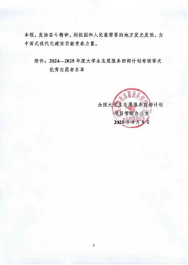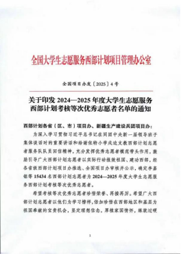 近日,全国大学生志愿服务西部计划项目管理办公室发布《2024-2025年度大学生志愿服务西部计划考核等次优秀志愿者名单》,我院2024届本科毕业生、2025级研究生张圣豪同学(第26届研究生支教团成员)荣获“西部计划考核等次优秀志愿者”称号。