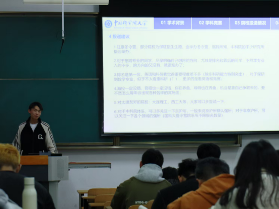 保研至中国科学技术大学的殷啟嘉向同学们深入解读了择校策略与保研政策中科技创新成果的评价准则,结合自身科创探索经历,鼓励同学们勇于突破、积极实践,在学术创新中积累竞争力。