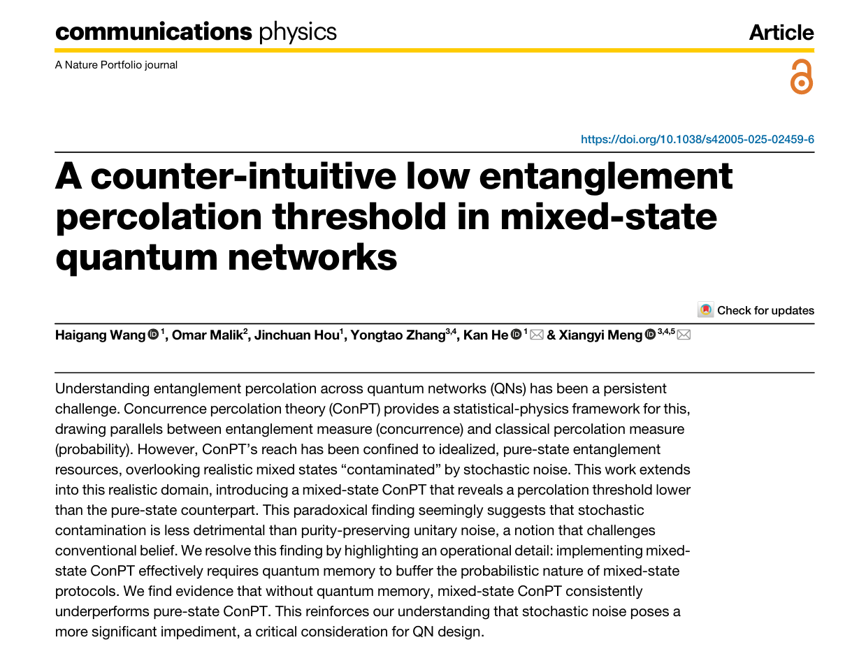 近日,我校数学学院的算子理论与量子信息团队应用算子理论和统计学等数学工具,在量子信息与统计物理领域中的纠缠渗流问题上取得研究进展。该研究工作以题为“A Counter-Intuitive Low Entanglement Percolation Threshold in Mixed-State Quantum Networks”的学术论文发表在期刊《Communications Physics》上。该论文的第一署名单位为太原理工大学,第一作者是我校博士生王海港,合作者包括侯晋川教授,Omar Malik博士和张勇涛博士,通讯作者为贺衎和美国伦斯勒理工学院孟祥一。