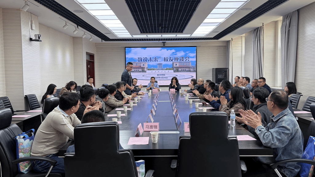 10:40-12:30,在学院602会议室开展“数说未来”校友座谈会,会议由学院党委副书记李楠楠主持。会上,孙莉书记致欢迎辞,对校友返校表示热烈欢迎,并详细介绍了校友分会的组织架构、联络服务及分会活动亮点,感谢校友们长期以来对学院的支持。杨卫华院长全面介绍了学院发展情况,从办学空间变迁、专业历史沿革,到师资队伍建设、博士点获批与评估,以及学院十五五发展规划,充分展现了学院的蓬勃生机。贺衎副院长溯源数学学科发展根基,讲述了学科先贤-常师贞先生的生平事迹,传承数学教育薪火。高犇副院长介绍了常师贞数学教育发展基金的设立背景、用途及运作情况。