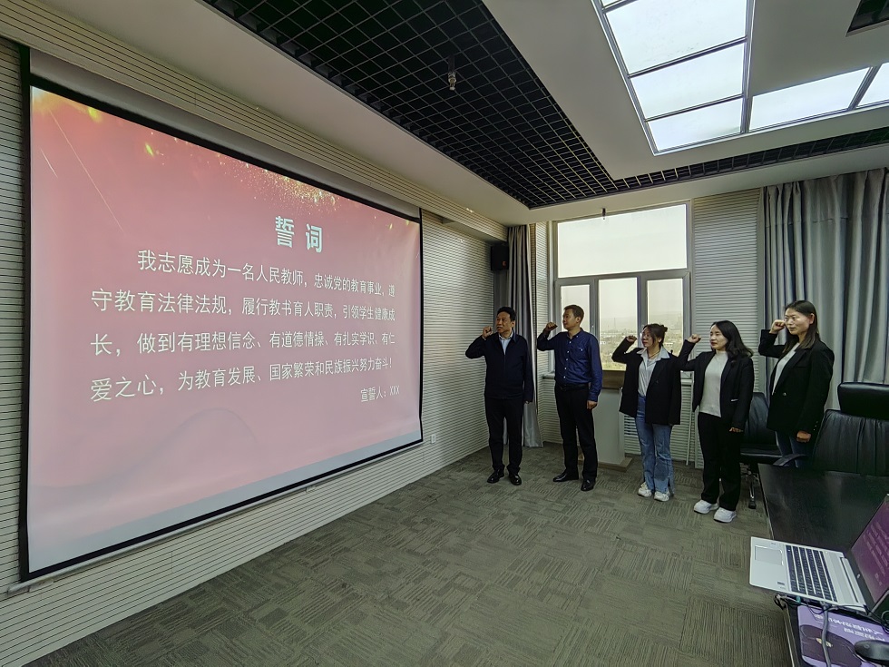 会议举办了2023年新入职教师集体宣誓仪式,院党委书记游志勇和院长杨卫华领誓,与3名新教师一起高举右拳,庄严宣誓。铮铮誓词,铿锵有力,表达了新教师牢记教师初心与踔厉奋发的决心,进一步增强新入职教师的荣誉感、责任感和使命感,弘扬高尚师德,树立良好师风。