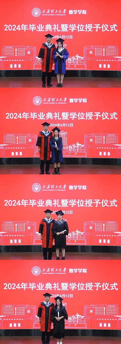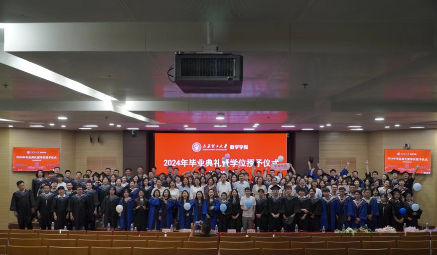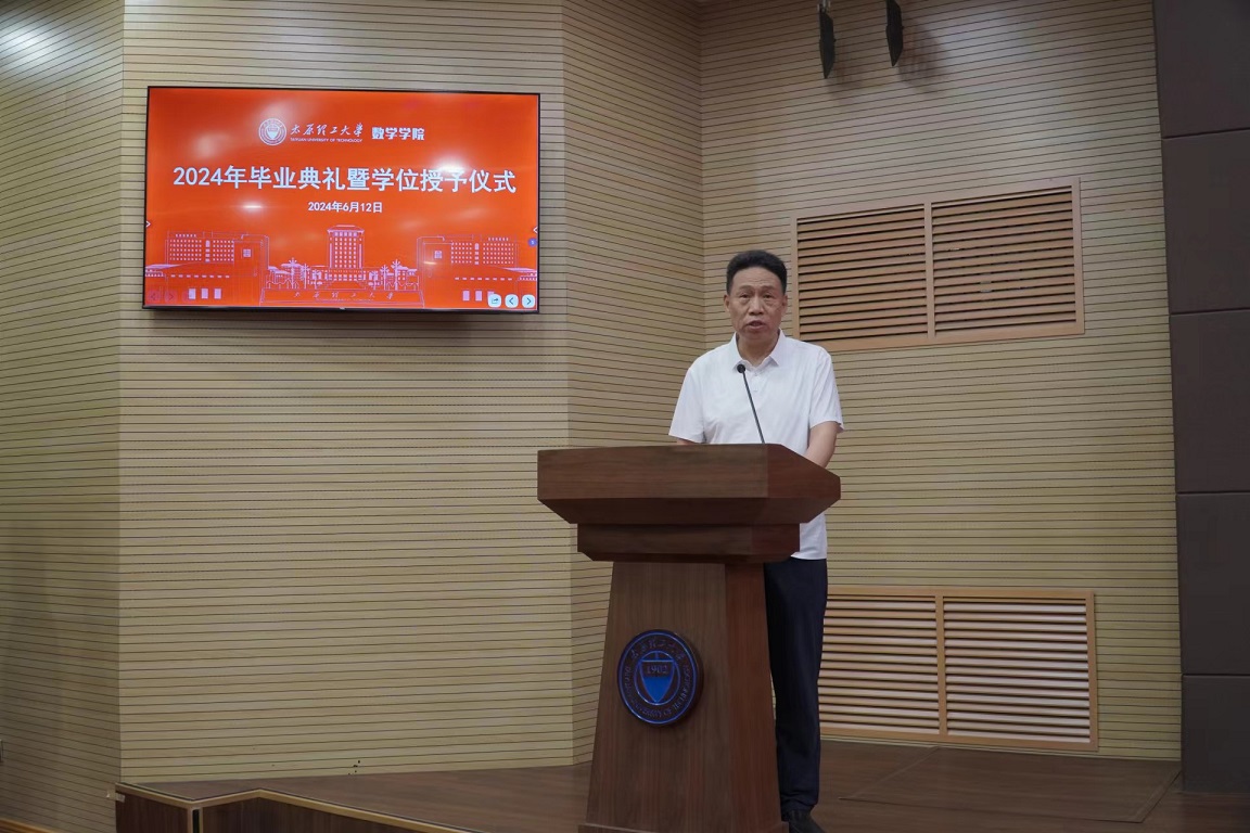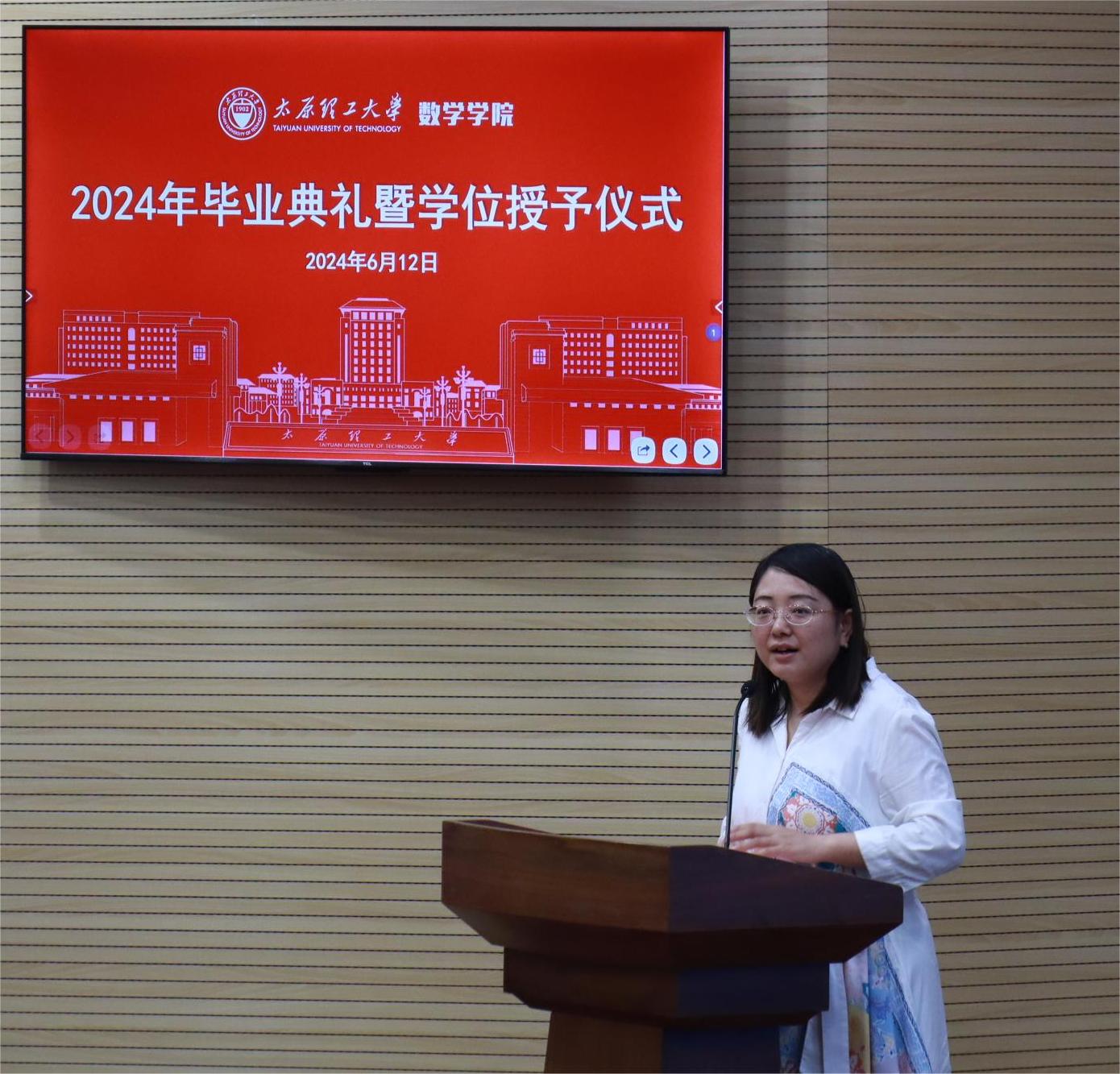 时光荏苒,岁月如梭。6月12日,数学学院2024年毕业典礼暨学位授予仪式在图书馆一层报告厅隆重举行。数学学院党委书记游志勇,院长杨卫华,院党委副书记李楠楠,副院长柴玉珍、滕凯民,系部中心主任,三办主任,教师代表,辅导员代表及毕业生家长代表等,与247名毕业生共同参加了毕业典礼。典礼仪式由李楠楠主持。