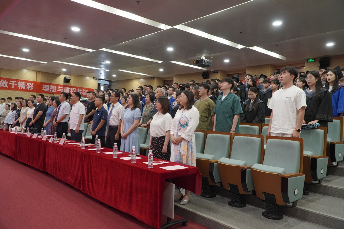 学海无涯,砥砺前行。教师代表郭睿教授上台发言,勉励毕业生们保持对知识的热爱和追求,勇敢面对未来的机遇和挑战。