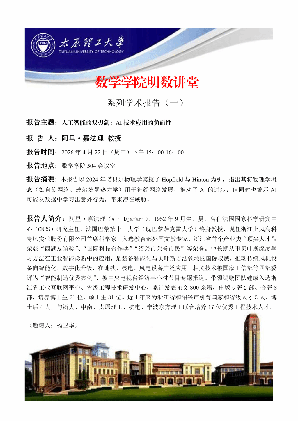 数学学院将于4月22日邀请阿里·嘉法理教授做学术报告